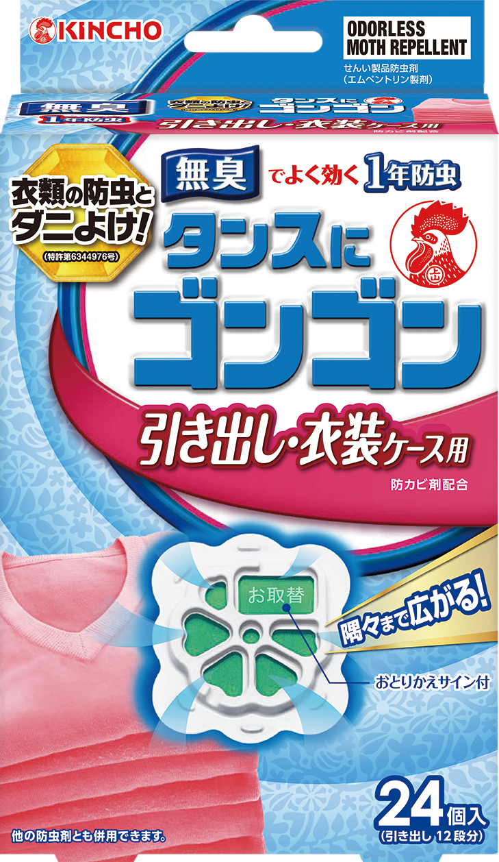 ダニよけ効果をプラスした防虫剤、“ゴンゴン1年防虫 引き出し・衣装ケース用”。